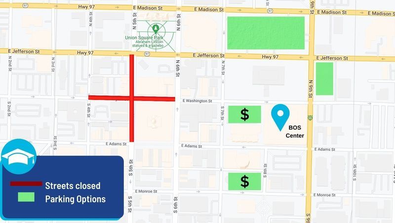 Families should make arrangements to meet outside on the Adams St. or Washington St. sides of the BoS Center after graduation.