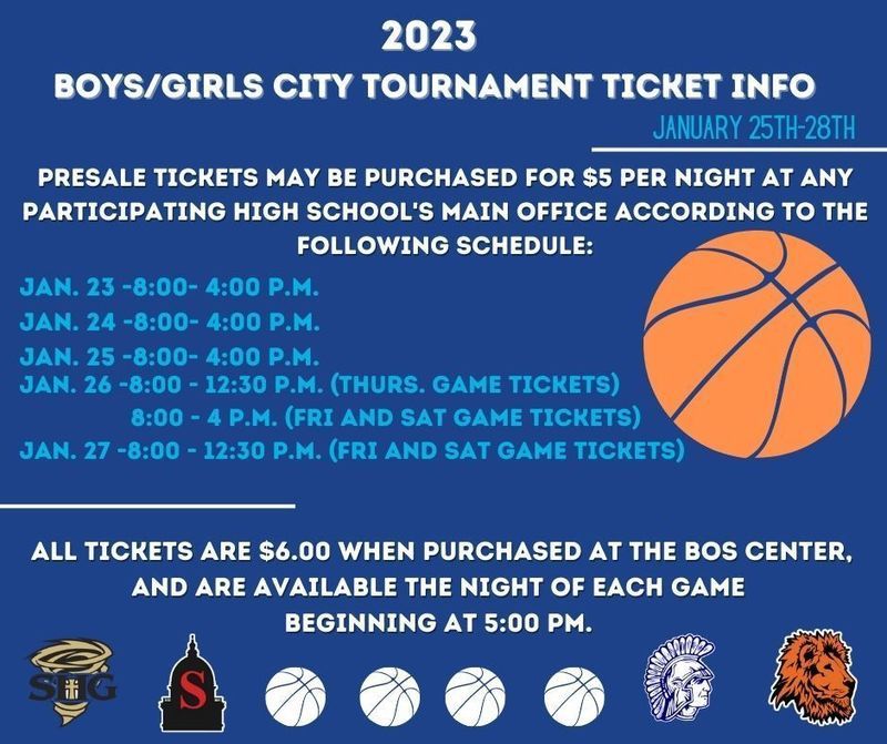 Boys/ Girls City Tournament Information : Presale tickets may be purchased for $5 per night at any participating high school's main office according to the following schedule: